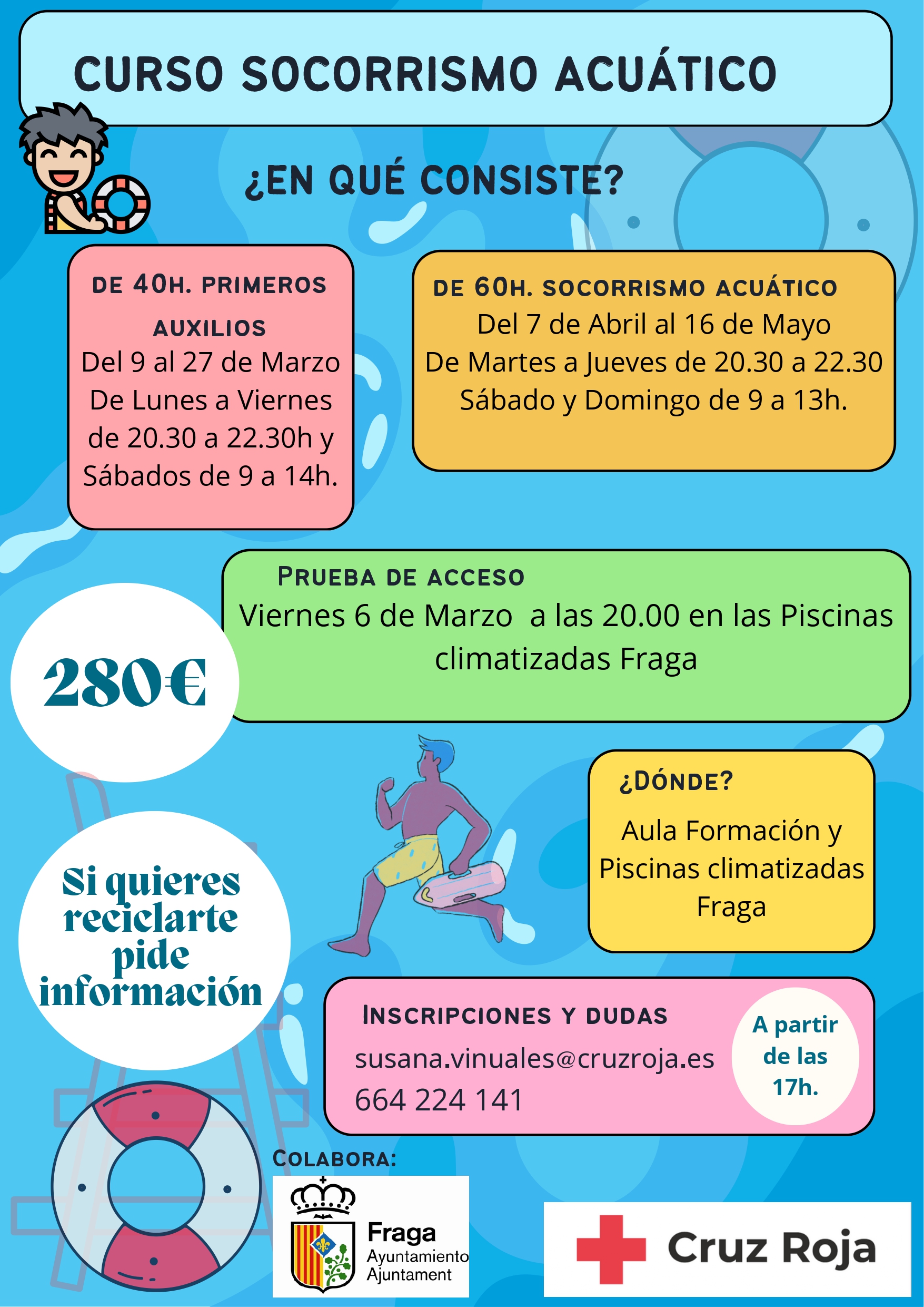 El Ayuntamiento de Fraga y Cruz Roja colaboran para ofrecer un curso de socorrismo acuático entre los meses de marzo y mayo. La formación se impartirá en el aula de formación de Cruz Roja y en las Piscinas Climatizadas de Fraga, y contará con un total de 40 horas de primeros auxilios, además de 60 horas de Socorrismo Acuático.